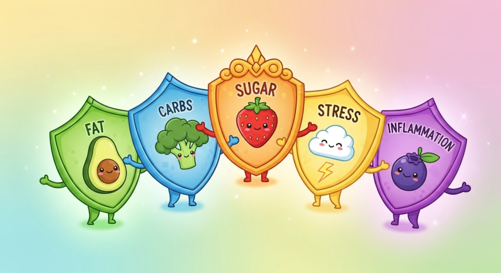 食事で気になる「脂質」「炭水化物」「糖」に、5つの厳選された成分が、まるで最強のガードマンのようにアプローチしてくれるんです🛡️✨